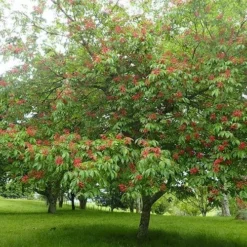 From the eastern United States, Aesculus pavia is a large, deciduous shrub of rounded, bushy habit, sometimes a small, conical tree. The glossy, deep green leaves are palmate (like a hand), as befits this relative of the horse chestnut, with 5-7 narrow leaflets, each 5”/13cm long. Long, upright panicles, 6”/15cm long, of crimson flowers, sometimes marked with yellow, are borne in June and July, and are good for bees. Clusters of light brown, smooth skinned fruits follow in autumn; be aware that these are inedible, even slightly toxic. Red buckeye is good as a lawn specimen in smaller gardens.
