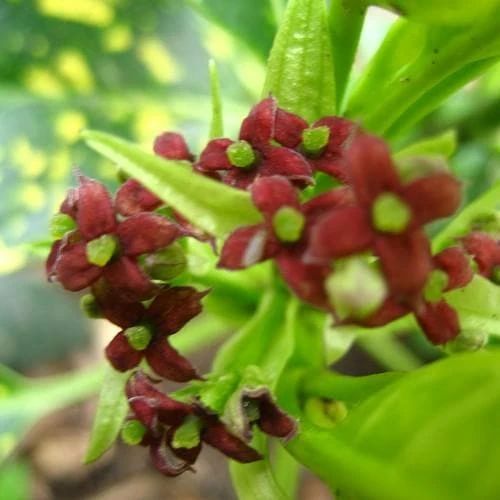 A large leathery leaved evergreen shrub with yellow spotted and speckled variegated leaves. The leaf markings of this cultivar are noticeably variable in size, from large blotches to tiny specks. Flowers are small and purple and are followed by bright red berries when pollinated. Aucuba japonica Crotonifolia is a good tough shrub for difficult spots and tolerates dry shade and salt air. Grows well in a container. Female, requires a male pollinator for berries.