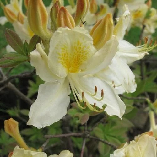 A medium sized deciduous shrub with large, fragrant, pink flowers that open to white with a yellow blotch. The beautifully scented flowers appear before the leaves in May to June. This variety is more compact than most and has excellent Autumn colour.