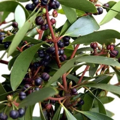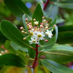 Also known as Drimys lanceolata or Tasmannia lanceolata, Drimys aromatica is a large evergreen shrub or small tree, with a dense, upright, almost columnar habit and deep red shoots. The glossy, dark green leaves are 3”/8cm long and lance-shaped; they have a strong, peppery taste, as do the berries. In April, clusters of tiny, fragrant, cream to pale yellow, star-shaped flowers are borne on the red stems, followed in autumn by round black berries. A trouble-free plant for milder areas, it’s ideal in a woodland planting. Tasmanian pepper is only hardy to about 5 degrees of frost, so is not for colder areas.