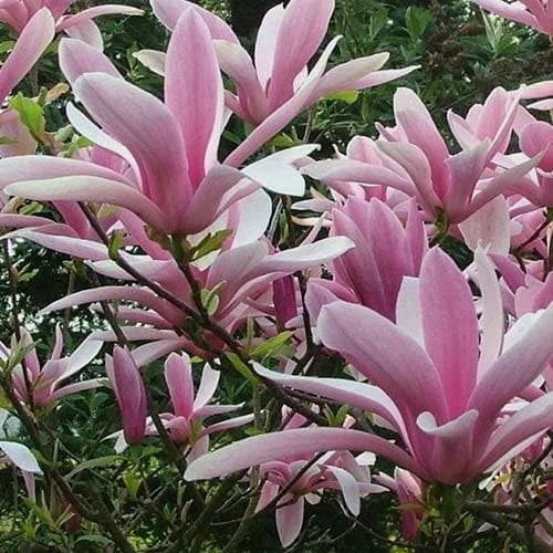 A hybrid between Magnolia stellata and Magnolia liliiflora Nigra, Magnolia George Henry Kern is a slow-growing, medium-sized, deciduous shrub with a compact, almost pyramidal habit, suitable even for small gardens. The shiny, fresh green leaves are elliptical in shape, and turn copper-bronze in autumn. Beautifully scented, soft pink, goblet-shaped flowers, with a deeper pink flush on the outside of the eight petals, are borne in March-April from rose-pink buds, with a few flowers appearing in July. Tolerates urban pollution, and requires minimal pruning and care, although a mulch is recommended to prevent the shallow roots from drying out. Magnolia George Henry Kern is one of the longest-flowering magnolias, and holds the RHS Award of Garden Merit.