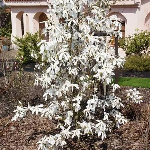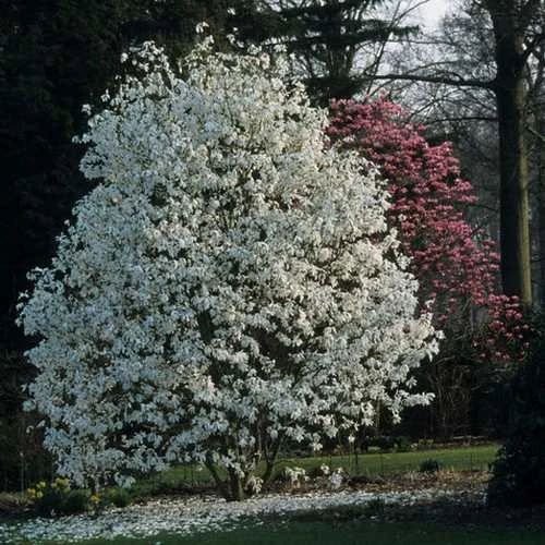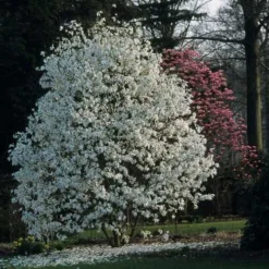 Believed to be a hybrid between Magnolia salicifolia and Magnolia kobus, bred in Japan, the willow-leaved magnolia, Magnolia x kewensis Wada’s Memory is a small, graceful, slow-growing, deciduous tree, conical when young, but developing a broad crown as it matures. Scented, semi-double white flowers appear in mid-spring on the bare branches. The big, oval leaves emerge reddish, turning bronze and then green. Bright pink knobbly fruits containing orange-red seeds form in autumn. Very little pruning required; prune in late summer to prevent ‘bleeding’. Holds the RHS Award of Garden Merit.