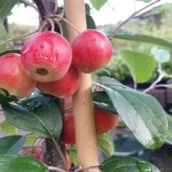 A highly ornamental crabapple, Malus x atrosanguinea Gorgeous is a small, deciduous tree, the perfect specimen for year-round interest in the smaller garden. Masses of pink and white blossom in April–May are followed by heavy crops of large, orange-red fruits 5cm across, which make a very good jelly, or can be used to make pectin for other jams. Pick in November; any fruit left on the tree persists until into the new year before the birds eat it. Foliage shows orange and yellow tints in autumn. Self-fertile.