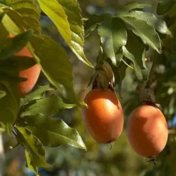 A beautiful plant with wonderfully complex, exotic flowers, Passiflora caerulea is a large, vigorous, woody, deciduous to semi-evergreen climber with clinging tendrils, best against a warm, sunny wall in mild areas – it will not thrive in colder regions. The dark green, glossy leaves have 5-7 long, finger-like lobes. From July to September, large white flowers, 3”/8cm wide, with blue and purple filaments, said to represent Christ’s crown of thorns, five anthers, representing His wounds and three upper stigmas, representing the nails of the cross. The flowers are followed, in warm summers, by ovoid, orange fruits. Blue passion flower holds the RHS Award of Garden Merit.