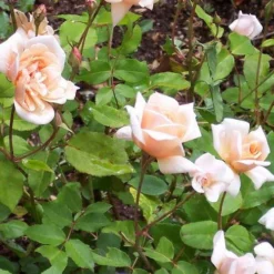 A pretty, polyantha rose, also known as Yellow Cécile Brunner, Rosa Perle d’Or is a medium-sized, deciduous, shrub rose with an upright habit and slender, rather thorny stems. The divided leaves are a good, glossy green. In summer and autumn, hybrid tea-shaped apricot buds buds open into double flowers which open apricot, then fade to creamy-apricot, deeper at the centre. This neat little rose flowers almost continuously, and is ideal as a buttonhole rose. Perfect for the smaller garden, rose Perle d’Or holds the RHS Award of Garden Merit.