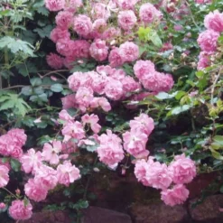 A floriferous, ground-cover rose, Rosa Pheasant is a rather thorny, deciduous ground-cover rose with a low, creeping, spreading habit, ideal for planting on a bank or other awkward site where weeding is difficult. The abundant, divided foliage has finely toothed, ovate, glossy, mid-green, leaflets. In midsummer, the plant bears clusters of lightly fragrant, semi-double, cup-shaped, long-lasting, clear rose-pink flowers with prominent yellow stamens; there is some repeat-flowering over the summer. Ground-cover rose Pheasant is a robust, healthy rose, with excellent disease-resistance.