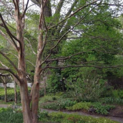 A camellia relative, Stewartia pseudocamellia var. Koreana is a large, slow-growing, deciduous shrub or small tree, with a spreading, open habit and grey bark peeling decoratively to reveal orange, purplish and cinnamon-coloured inner bark. The ovate leaves are deep green, turning bright orange and red in autumn. Single, pure-white, camellia-like flowers, over 2”/5cm across, with a prominent boss of golden-yellow stamens are borne over a six-week period in midsummer; these are a valuable nectar source. Korean stewartia is a beautiful specimen shrub or tree, with year-round interest, if given the right conditions. It dislikes disturbance, so plant it in the right spot first time.