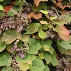 A large, handsome, deciduous climber with the most beautiful autumn colour, Vitis coignetiae is a very vigorous, tendril-climbing climber from Japan which will need substantial support. It can be grown informally through a sturdy tree, or along a long south- or west-facing wall. The heart-shaped, deeply-veined leaves, up to 1’/30cm long, with 3-5 shallow lobes, are deep green, thickly felted with tan beneath, and turn wonderful shades of scarlet, crimson, orange and purple through autumn. Insignificant, greenish flowers are borne in May and June, and are followed by small, blue-black, inedible ‘grapes’. Crimson glory vine holds the RHS Award of Garden Merit.