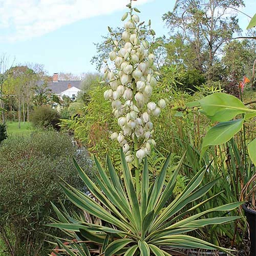 Ideal for an architectural effect in a courtyard or by the sea, Yucca gloriosa Variegata is a medium-sized, slow-growing, single-stemmed shrub with a handsome rosette of long, rigid, lance-shaped, blue-green leaves edged with creamy-yellow and with a sharp spine at the tips. From August to October, wide panicles of cream, bell-shaped flowers rise above the leaves. Rabbit- and drought-resistant. Do not plant near a path, or where young children have access, as the spines at the leaf-tips are very sharp. Variegated Spanish dagger holds the RHS Award of Garden Merit.
